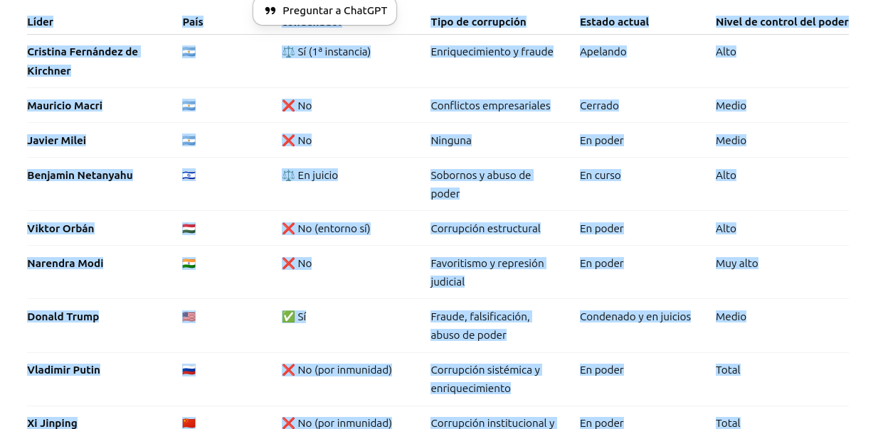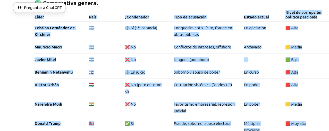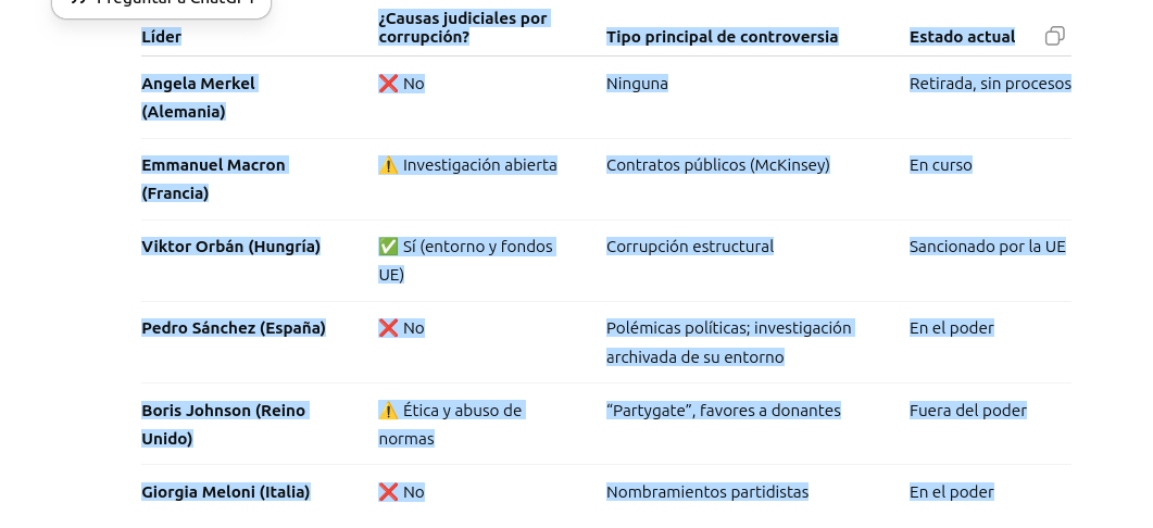 Líder Acusaciones formales Tipo de irregularidad Estado actual Angela Merkel ❌ Ninguna — Sin casos Emmanuel Macron ⚠️ Investigaciones en curso Contratos públicos (McKinsey) Sin imputación Viktor Orbán ✅ Sí (a nivel UE) Corrupción sistémica y fondos europeos En disputa con la UE