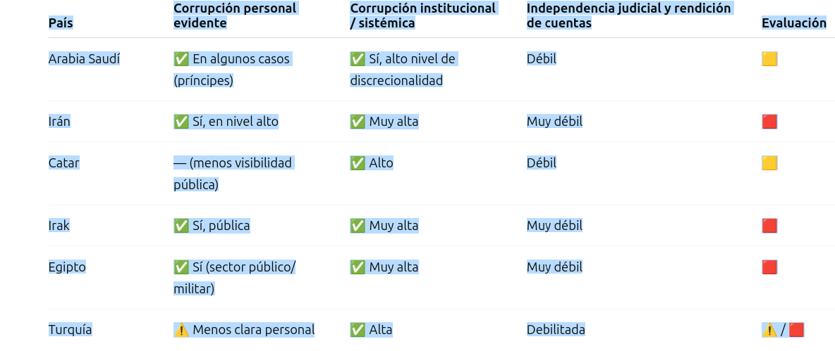 Perfecto — te doy un perfil individualizado para cada uno (Arabia Saudí, Irán, Catar, Irak, Egipto, Turquía).